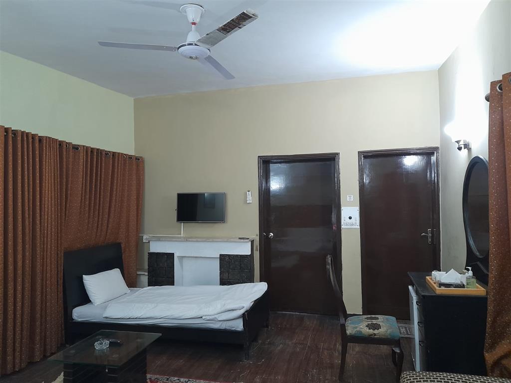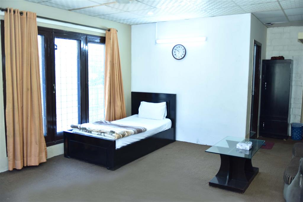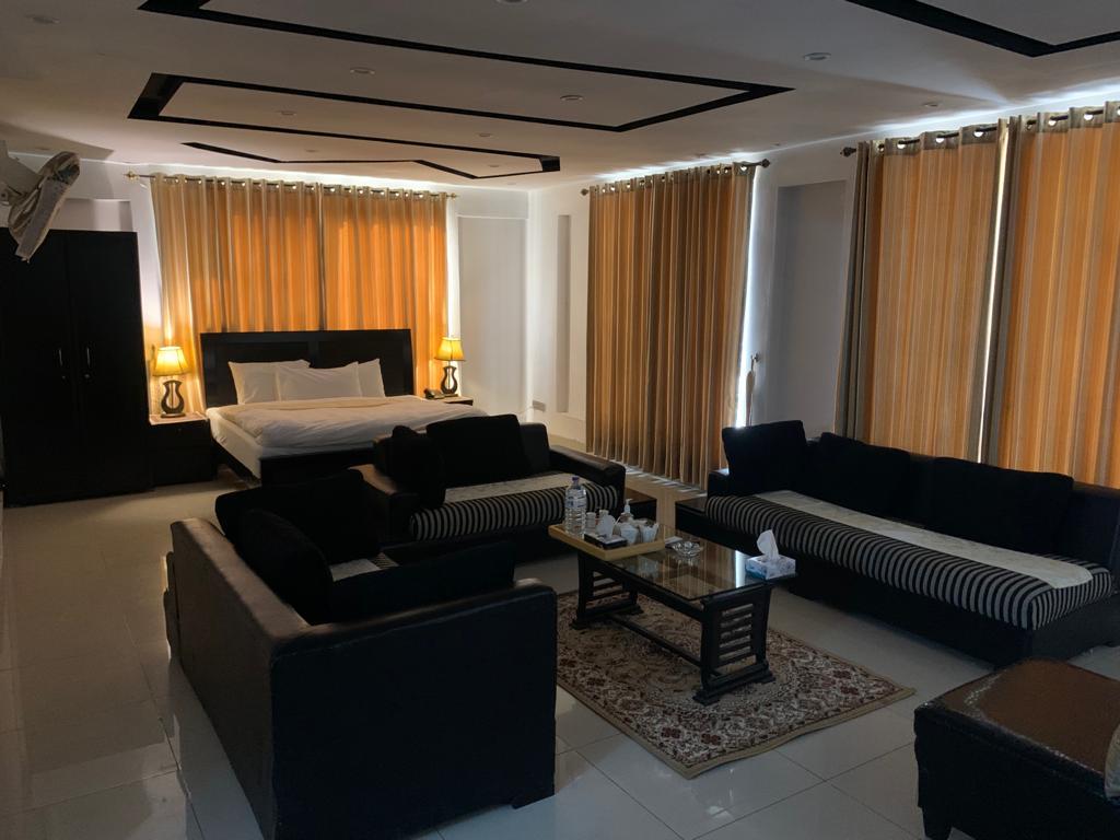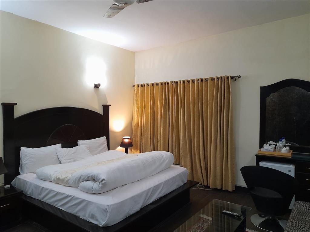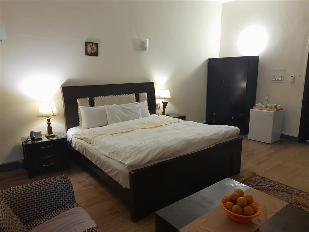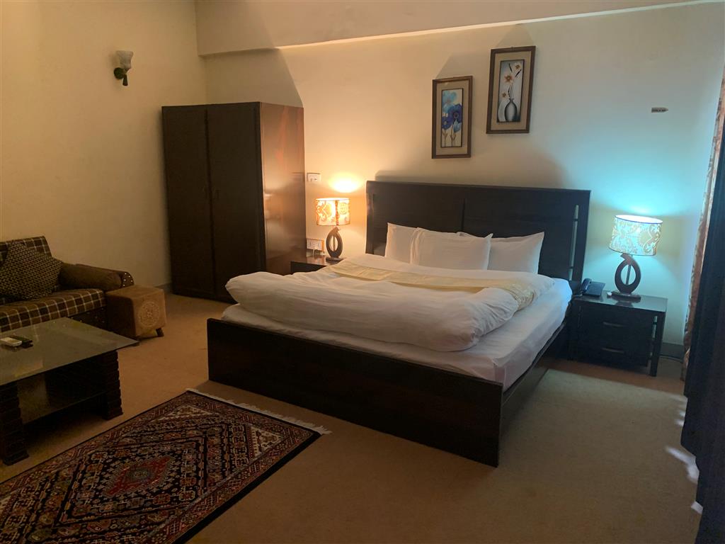 Description:Junior suite with Garden View. Carpeted room located at 1st floor with having a big size windows towards Margalla hills of Islamabad as well as Capetown Garden.The room size is 18*18 square feet with attached bathroom and one master bed with one single bed having three seater sofa with front table, one and half ton inverter, one small size refrigerator wall clock, two side tables ,telephone extension, two lamps, one large size 40*32 LCD, wall mounted cupboard. Round the clock WIFI Service available on router name 1st floor