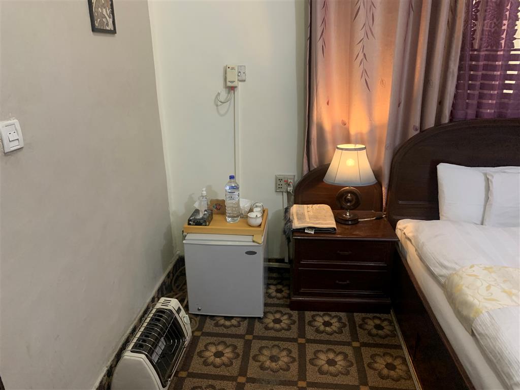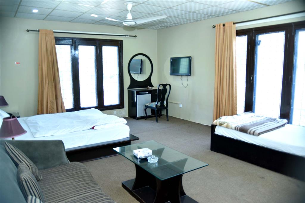 Description:COMFORT TRIPLE ROOM: Located at Ground floor, One king size master bed, One small bed with Glass table, office chair with desk table, dressing table, attached Bath Room, Roof mounted celling fan small size refrigerator, wall mounted LCD and two doors cupboard, two single setter sofa, one telephone extension 24/7 connected with the reception, two side lamps, and one and Half ton AC. Round the clock WiFi single reachable through router name 1st floor.